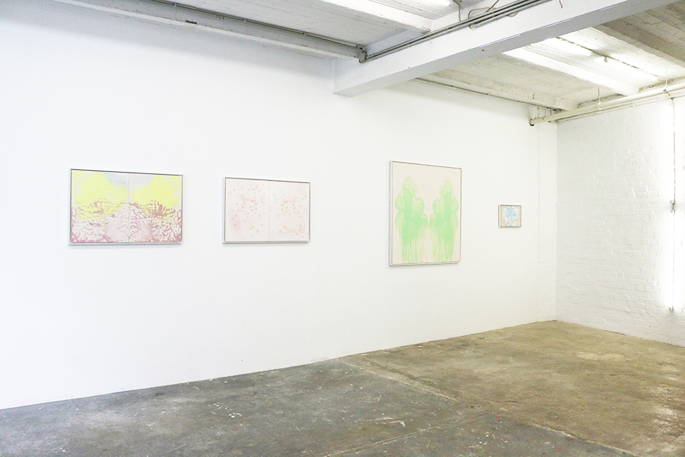 OCEAN FLOWERS – Flocks of Sulfur Yellow and Dusky Pink – 2022- acrylic on wood panels (MDF), in artist frame, 63 x 99 x 4,5 cm; OCEAN FLOWERS – A Rose Garden/Rosengarten –2024 – acrylic on wood panels (MDF), in artist frame, 63 x 99 x 4,5 cm; OCEAN FLOWERS – Turquoise Green – 2023 – acrylic on wood panels (MDF), in artist frame, 122 x 122 x 4,5 cm; OCEAN FLOWERS – Dark White and Pale Pink – 2024 – acrylic on wood panels (MDF), in artist frame, 32 x 50 x 3 cm.