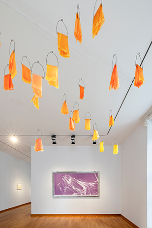 vorne: Annika Unterburg, „In Fly Flocks of Birds“, 2024-2025, 25 wooden bird swings, pigments on silk, each 27 x 9 x 1 cm, back: Tanja Hehmann, „NEW BEGINNINGS #13“, 2025, exposed fabric on aluminium frame, 130x220cm; Foto: Helge Mundt, Annika Unterburg I Tanja Hehmann © VG Bild-Kunst, 2026