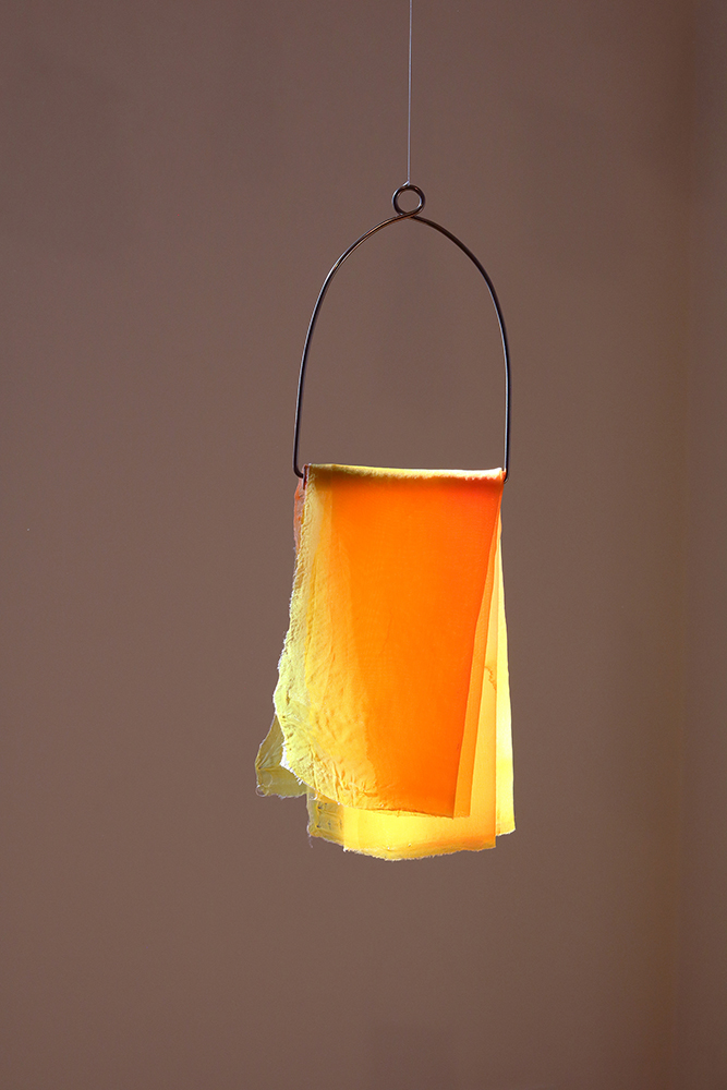 Lemon Yellow, Magenta Spot on Orange (The Portrait of the Bird) – 2025 – , pigments on silk, bird swing, 27 x 9 x 1cm. Detail of the installation In Fly Flocks of Birds (The Portrait of the Bird) – 2024–2025 photo credit – Maren Unterburg