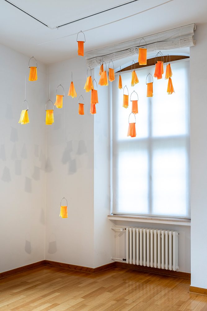 In Fly Flocks of Birds (The Portrait of the Bird) – 2024–2025 – Installation of 25 bird swings, pigments on silk, size variable, each 27 x 9 x 1cm. exhibition: THE THIRD SPHERE, (duo exhibition with Tanja Hehmann), Städtische Galerie Eichenmüllerhaus, Lemgo, DE, 2025 photo credit – Helge Mundt