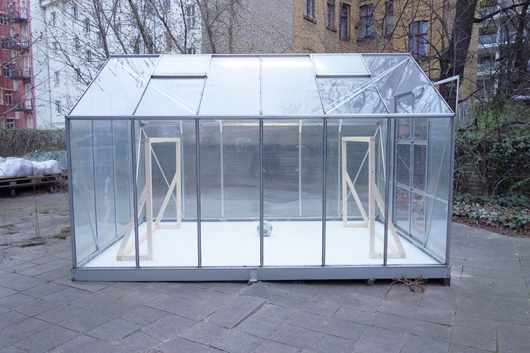 It’s about the private. At least that is what the domestic context suggests in which Annika Unterburg’s installation „Now The Ball Is On Your Side“ is located and observable by the viewer. A football, the simple wooden construction of two opposing goals and a chalk mark on the ground form the provisional scenery of a playing field inside the greenhouse. The conflict between the winner and the loser can be anticipated. The calm before the storm seems to be audible. Regardless of who will win here: The space surrounding the match will probably break.