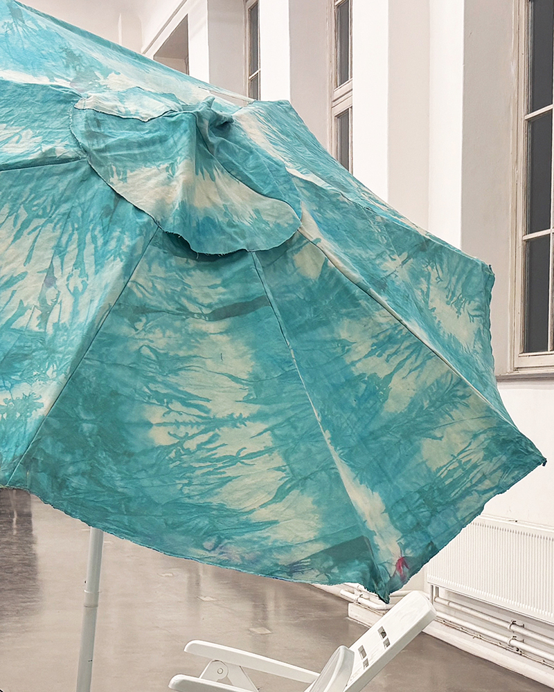 LSF 50 (Lichtschutzfaktor 50) / SPF 50 (detail) – 2025 – canvas, beach umbrella (second hand), batic dye, acrylic, 200 x 200 x 200 cm.
